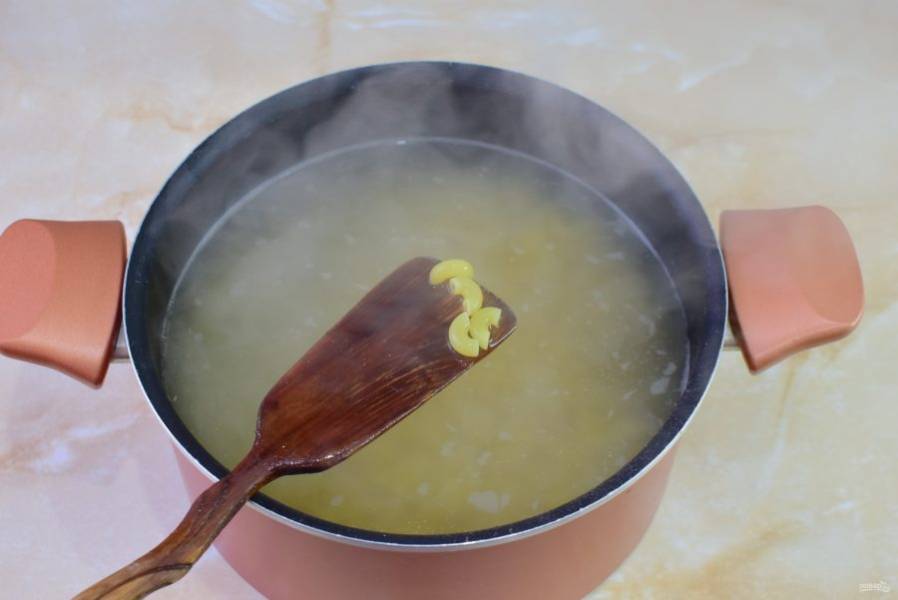 Макароны опустите в кипящую воду и варите до готовности. Обычно на это уходит 7-10 минут. Макароны должны стать мягкие.