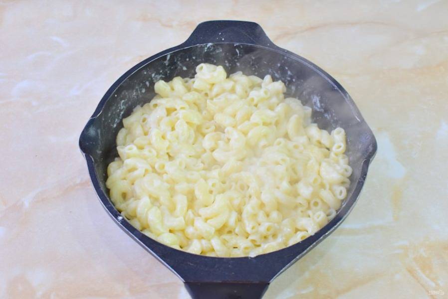 В конце залейте макароны сливками. Перемешайте и доведите до кипения. Если любите, чтобы соуса было много, то можно добавить больше воды.