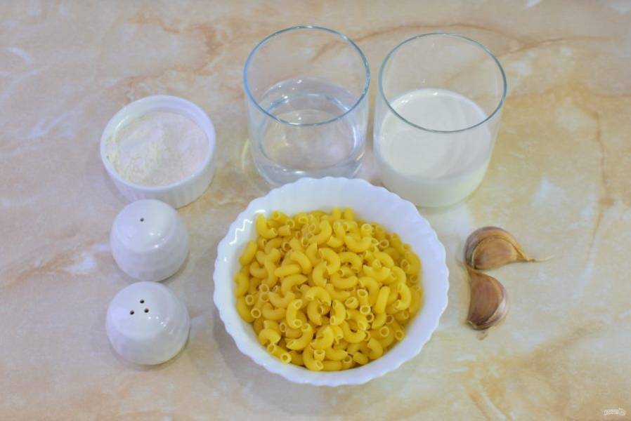 Воду смешайте с мукой и залейте макароны. При нагревании соус в макаронах будет становиться гуще. Пропустите через пресс чеснок.