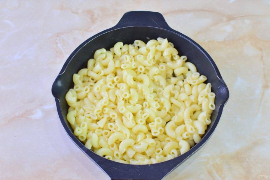 Готовые макароны откиньте на дуршлаг и пролейте холодной водой.