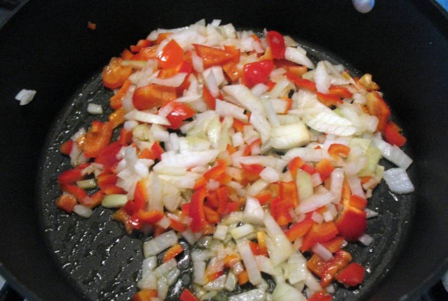 5. В таком виде сосиски с макаронами уже можно подавать к столу. Однако можно приготовить к ним еще и вкусный соус. Для этого необходимо очистить и нарезать кубиками луковицу и сладкий перец. Острый перец очистить от семян и измельчить.