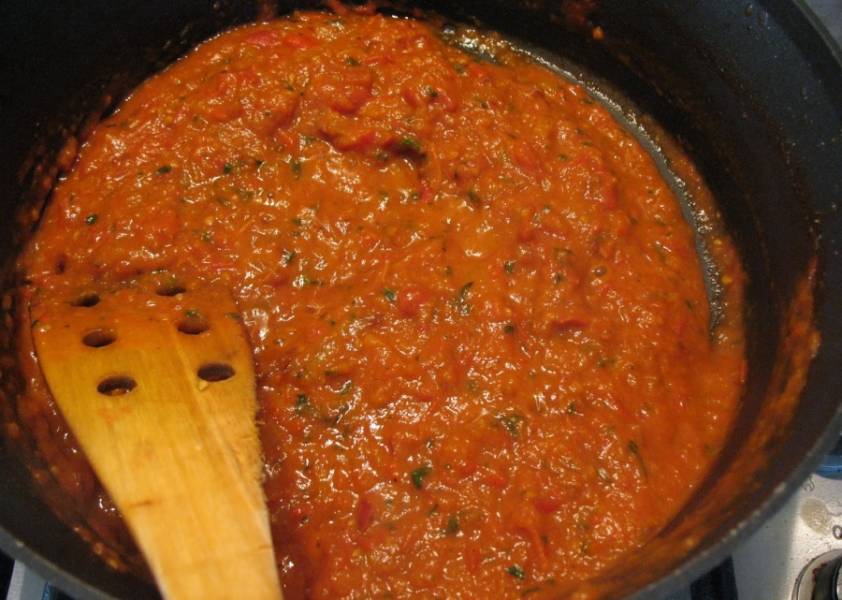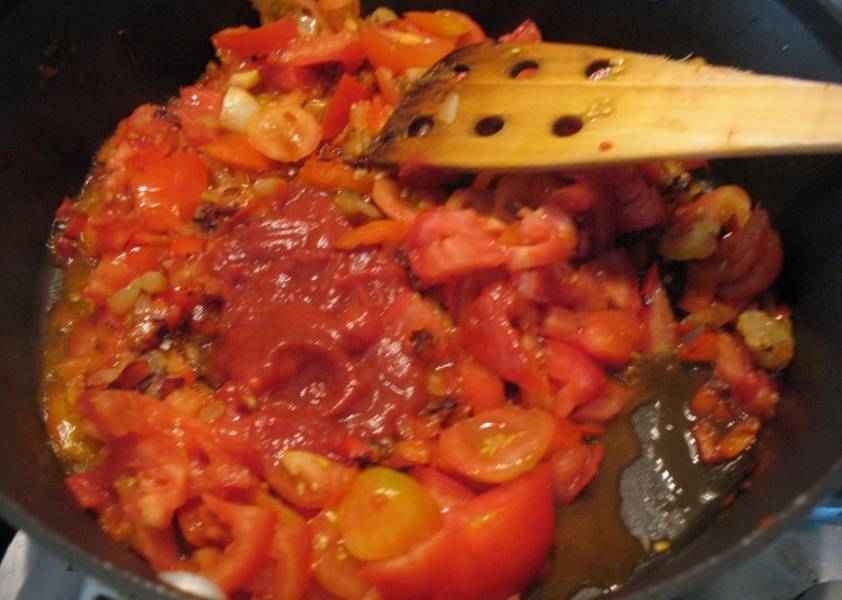 7. Тем временем вымыть и нарезать помидор. Когда перец и лук поджарятся, отправить на сковороду помидор и томатный соус. Посолить по вкусу.