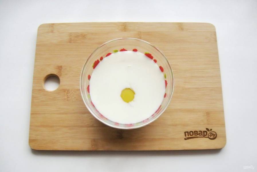 К яйцу налейте молоко и хорошо перемешайте.