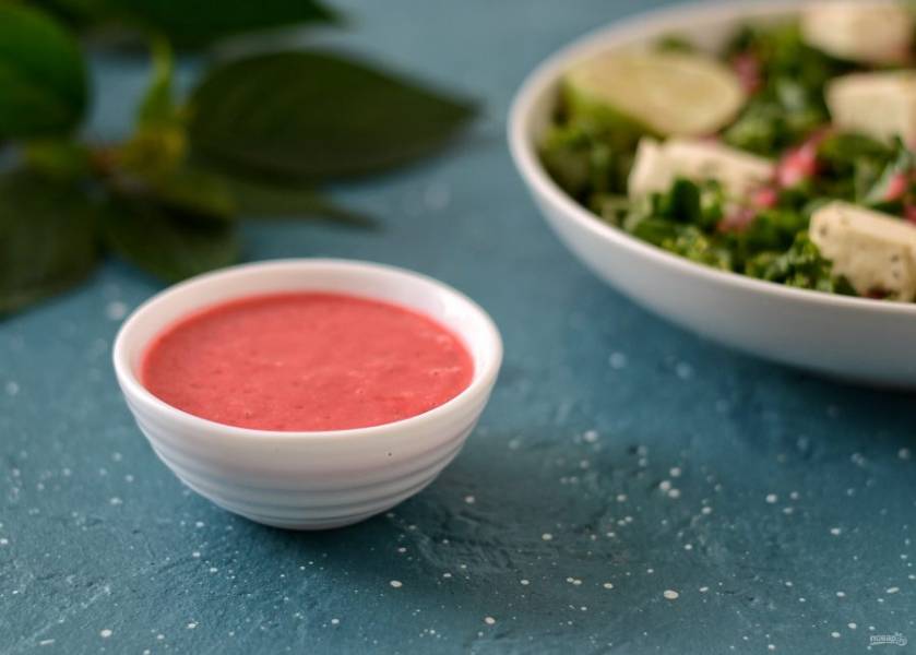 Измельчите малину, белый винный уксус, оливковое масло и лук в блендере. Добавьте соль и перец по вкусу.