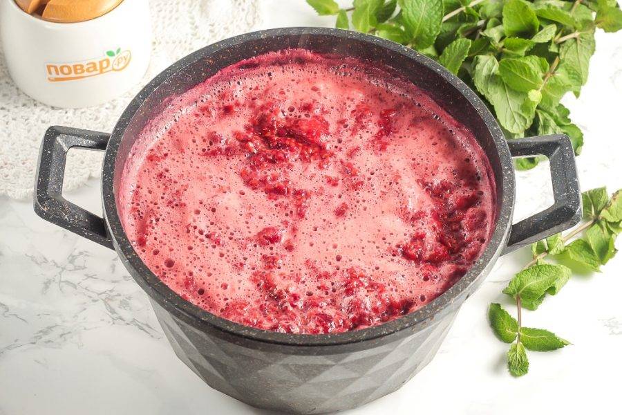 Перемешайте и отварите на умеренном нагреве примерно 10 минут. Затем снимите образовавшуюся пену и отварите еще 5 минут. Следите за тем, чтобы варенье не убежало на плиту!