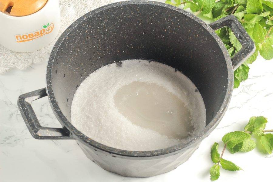В казан или кастрюлю с антипригарным дном всыпьте сахар и влейте теплую воду. Поместите емкость на плиту.