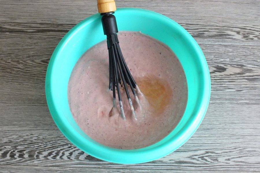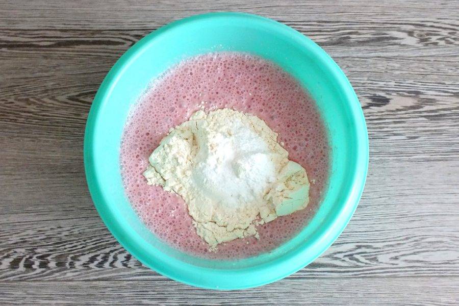 Добавьте муку, разрыхлитель для теста, соду, соль. Перемешайте. Оставьте на 15 минут.