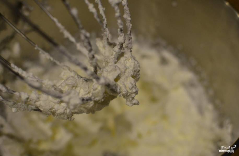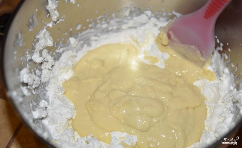 Как только желтки приобретут текстуру сгущенного молока, добавьте желатин и непрерывно мешайте до полного растворения. Охладите до комнатной температуры.