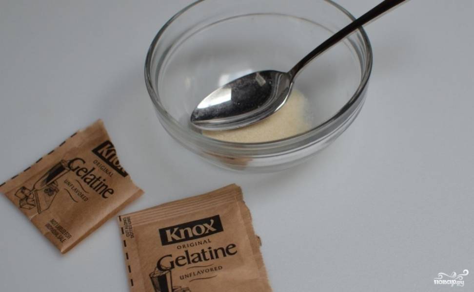 Для малинового желе замочите 2 пакетика желатина в холодной воде.