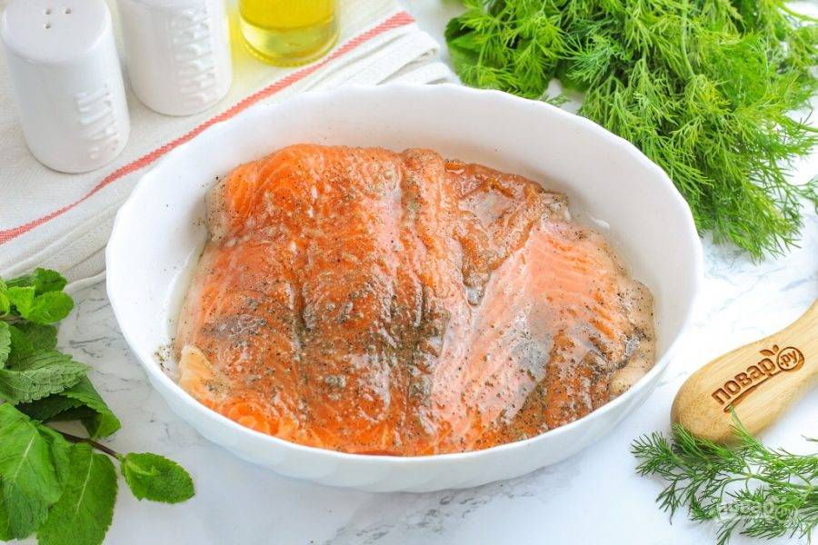 Далее сбрызните рыбу растительным маслом и обмажьте им со всех сторон. В таком виде поместите ее в холодильник для засолки на 4 часа минимум, а лучше — оставить ее на ночь.