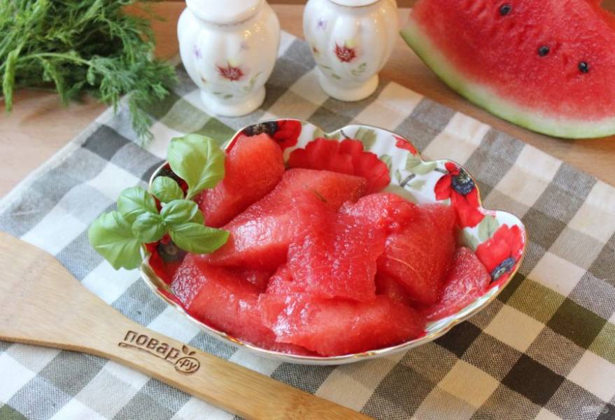 Малосольные арбузы готовы. Прекрасную пикантную закуску можно подавать на стол.