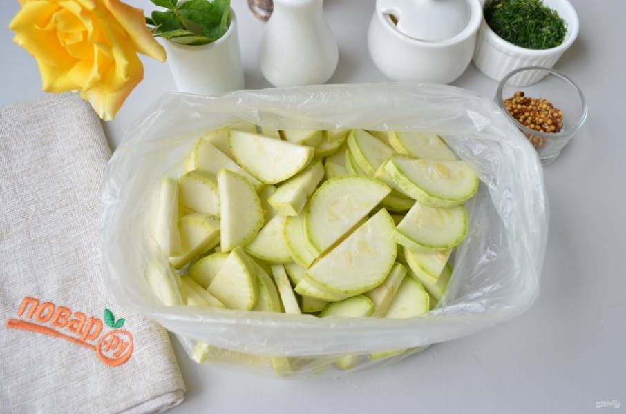 Кабачки порежьте на 2 части вдоль, затем — каждую половинку тонкими слайсами (толщина примерно 3 мм). Сложите их в чистый и сухой пакет.