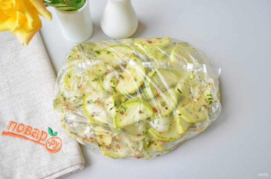 Завяжите не слишком плотно пакет, потрясите его, чтобы овощи и специи перемешались равномерно. Отправьте в холодильник на 15-20 минут. Вот и все! Малосольные кабачки "Хрустящие" готовы! Угощайтесь!
