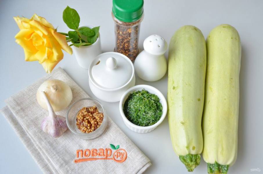 Чеснок порежьте мелко, лук — полукольцами. Добавьте их в пакет к кабачкам, также не забудьте про соль, сахар, перец чили и горчицу.