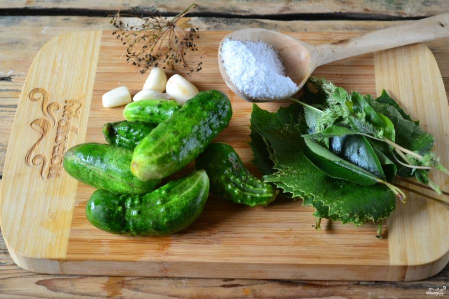 Подготовьте все необходимые ингредиенты. Огурцы замочите минимум на 2 часа в холодной воде. Они должны напитаться влагой и стать плотными, чтобы при засолке получиться хрустящими.