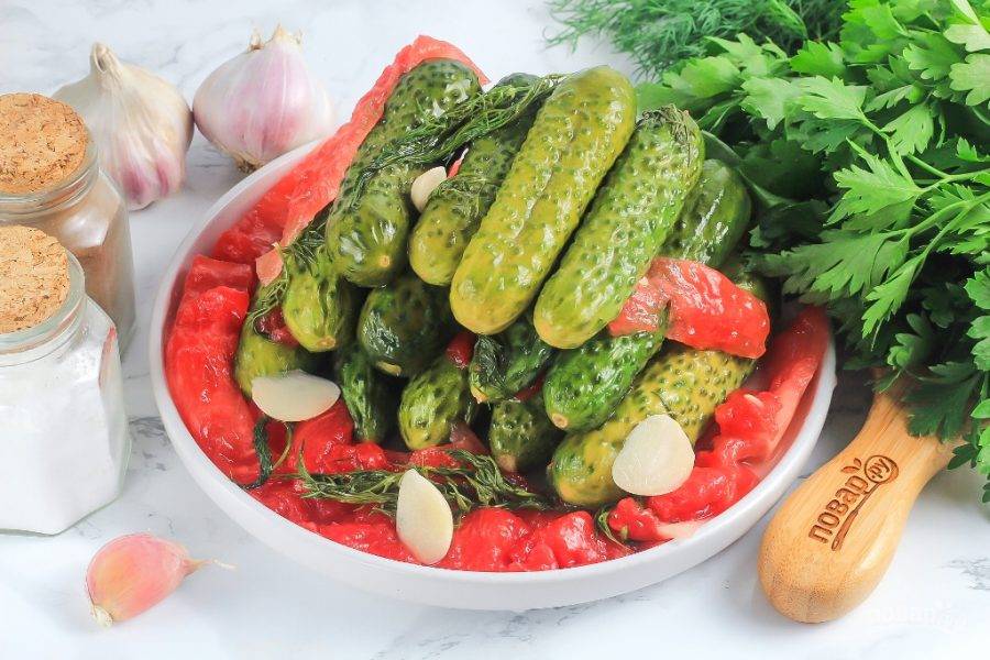 Выложите огурцы на тарелку и подайте к столу охлажденными. Можно подать и мякоть арбуза из рассола.