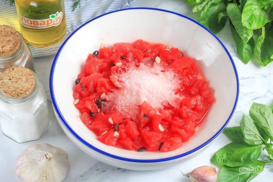 Половину арбузной мякоти раздавите в миске, всыпьте соль и влейте воду. Тщательно перемешайте.