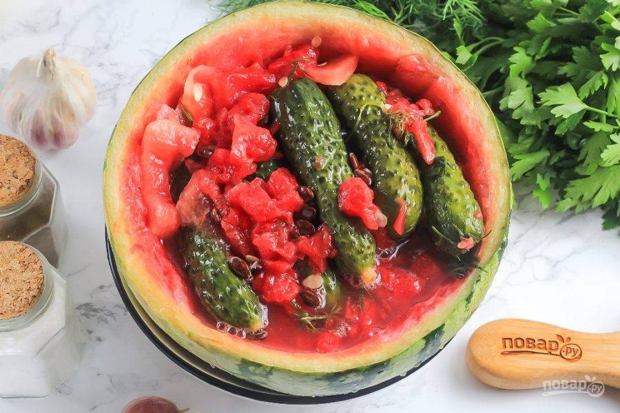 Залейте рассолом с мякотью огурцы в арбузе и оставьте их при комнатной температуре на сутки. Желательно поместить половину арбуза в миску, если вдруг рассол начнет вытекать.
