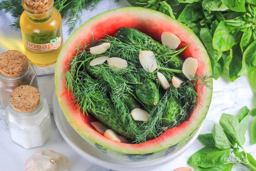 Сочные хрустящие малосольные огурцы с ярким арбузным послевкусием вы можете приготовить буквально за сутки. Вам не потребуется никакая посуда, огурцы солятся прямо в арбузе. Обязательно пробуйте!