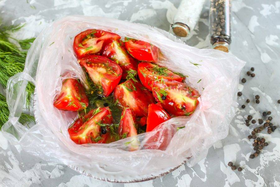 Промойте помидоры в воде, разрежьте каждый плод пополам, а затем половинки нарежьте ломтиками. Так как овощи при засоле выделят много сока, то лучше всего поместите пакет в пакет, чтобы он не порвался. Выложите ломтики помидоров в пакет.