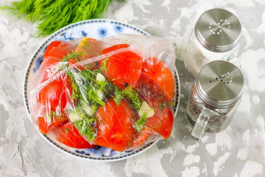 Яркие и сочные малосольные помидоры в пакете можно взять с собой на пикник - они как раз успеют просолиться! Закуску можно подать с гарниром из картофельного пюре или к жареной картошке.