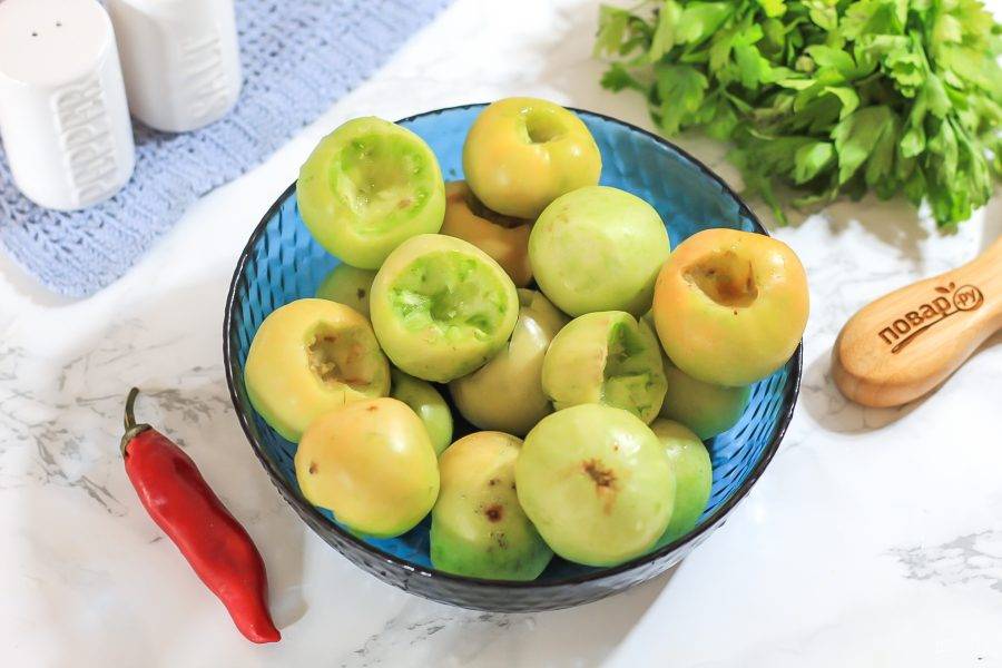 Помидоры промойте в воде. Вырежьте сердцевинки или наколите овощи в разных местах, если хотите оставить их целыми. Это делать нужно обязательно, чтобы рассол быстрее просолил и середину помидоров.