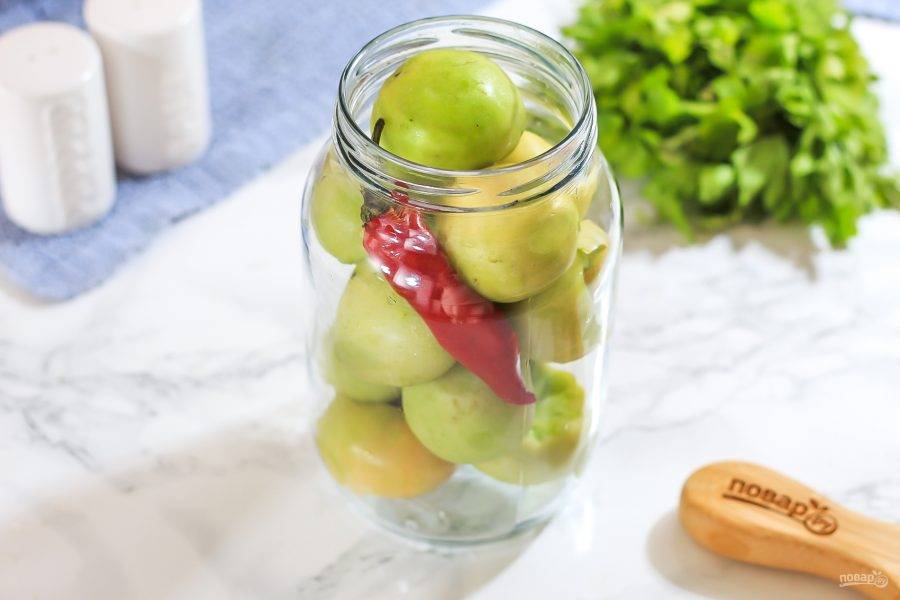 Заполните помидорами литровую банку или контейнер для пищевых продуктов (обязательно с крышкой). Не забудьте вставить промытый стручок острого перца. Можно дополнить помидоры очищенными зубчиками чеснока (4-5 шт.), но это по желанию.