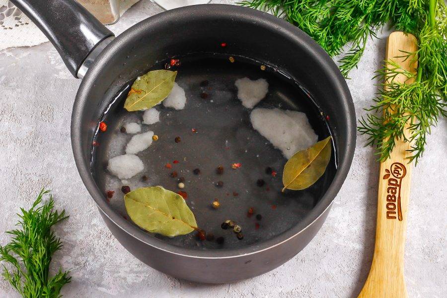 Влейте горячую воду и поместите емкость на плиту, доводя жидкость до кипения. По желанию можете всыпать и другие специи либо пряности. Но уксус не добавляйте! Остудите рассол на холоде.