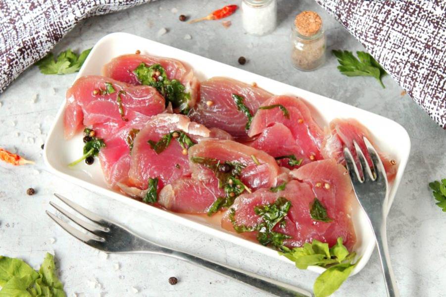 Мясо тунца по внешнему виду похоже на говядину. Оно полезное и невероятное вкусное, поэтому лучше всего не подвергать его тепловой обработке. Предлагаю тунца засолить и дополнить ароматом базилика.