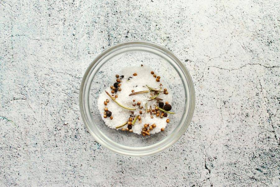 На дно формы насыпьте немного соли со специями. Филе тунца порежьте на кусочки и выложите в форму, пересыпая солью со специями.