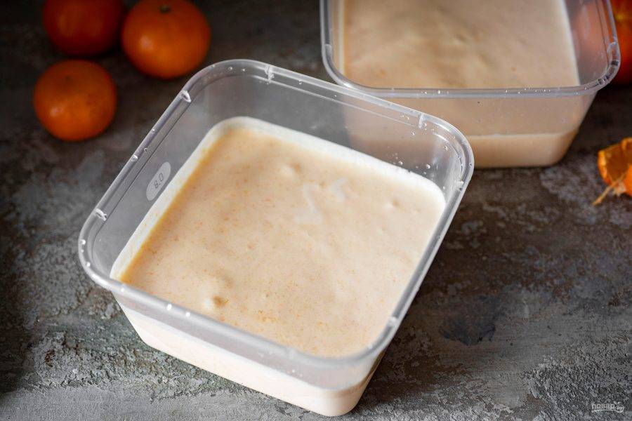 Однородную сливочно-мандариновую смесь выложите в удобный для замораживания пластиковый контейнер, закройте крышкой и поместите в морозильную камеру минимум на 4 часа. Несколько раз через промежутки времени в 40 минут пробивайте будущее мороженое погружным блендером.