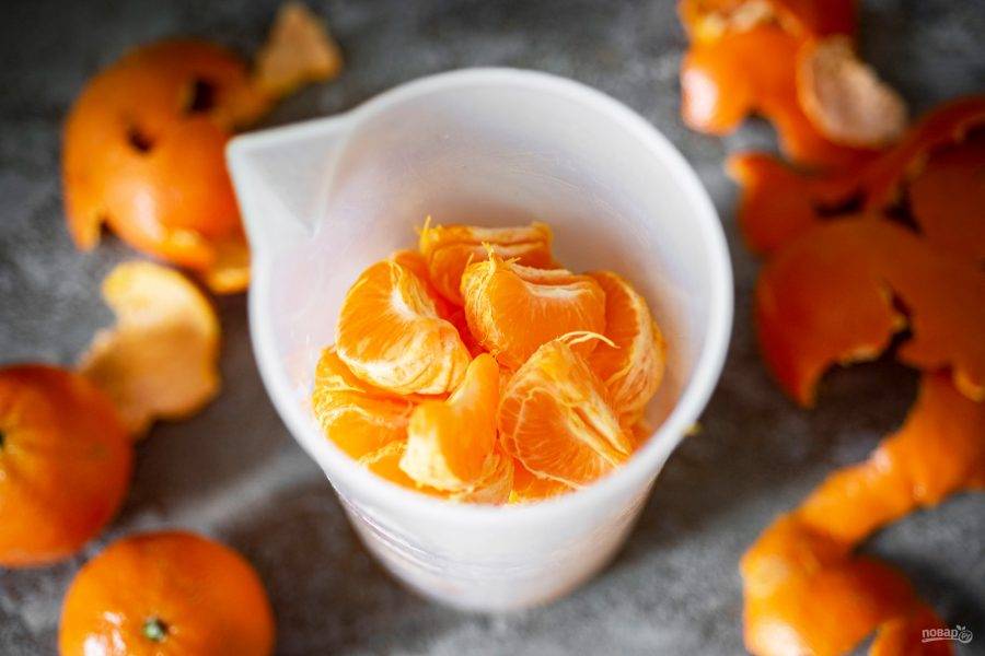 Почистите все мандаринки от кожуры и выложите их в удобную чашу для взбивания.