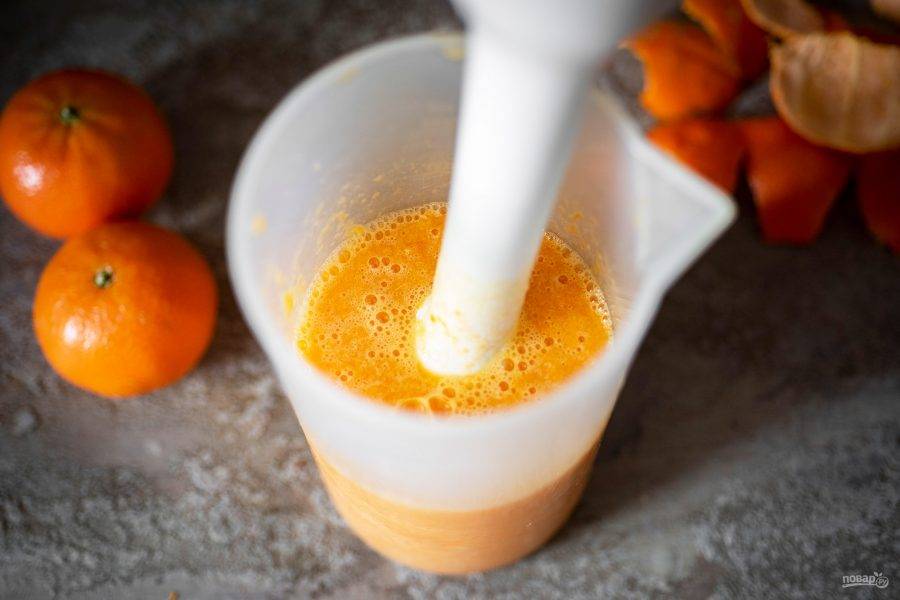 Погружным блендером пробейте все мандарины, превращая их в пюре.