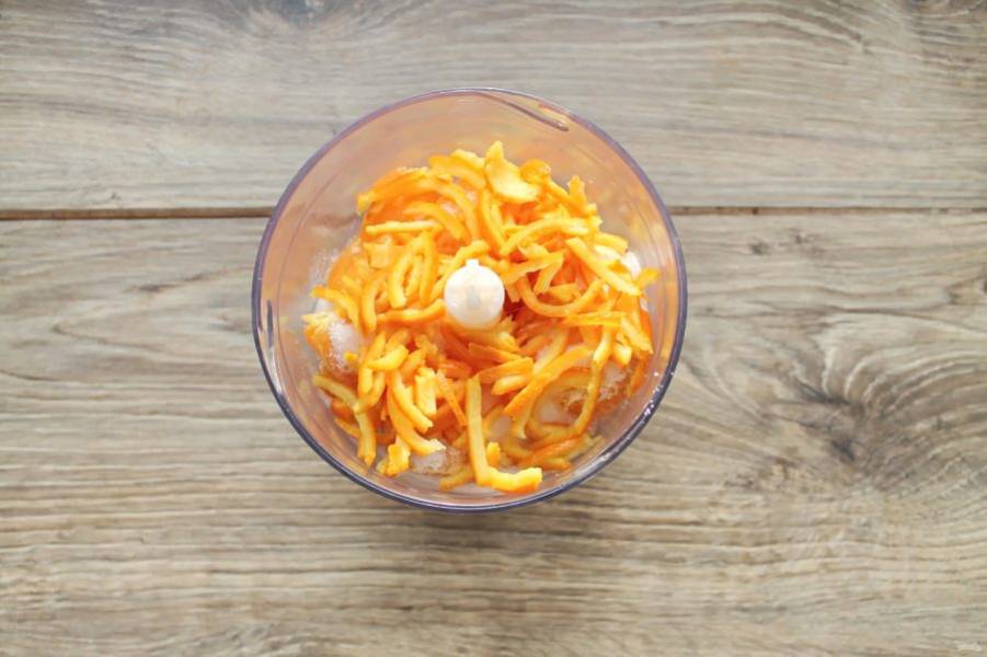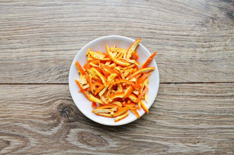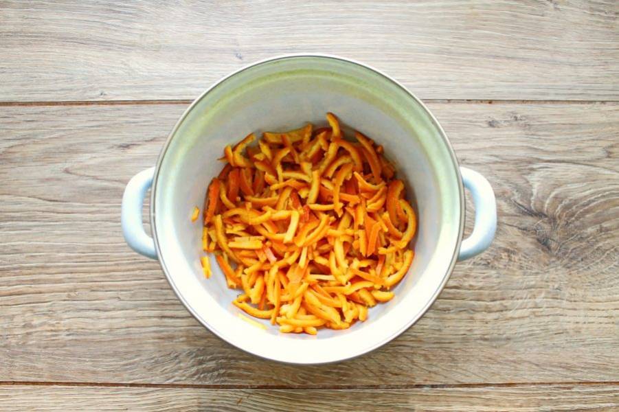 Выложите цедру в кастрюлю и залейте 500 миллилитрами кипятка. Дайте постоять в течение 5 минут и слейте воду. Это поможет избавиться от горечи и сделает цедру более мягкой.