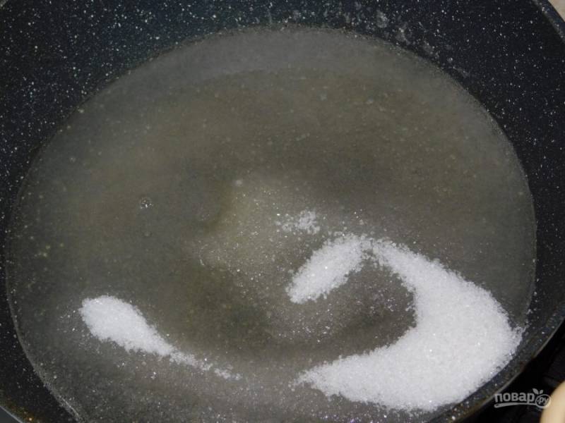 В широкую посуду насыпьте сахар и влейте 100 мл воды. Доведите до кипения.