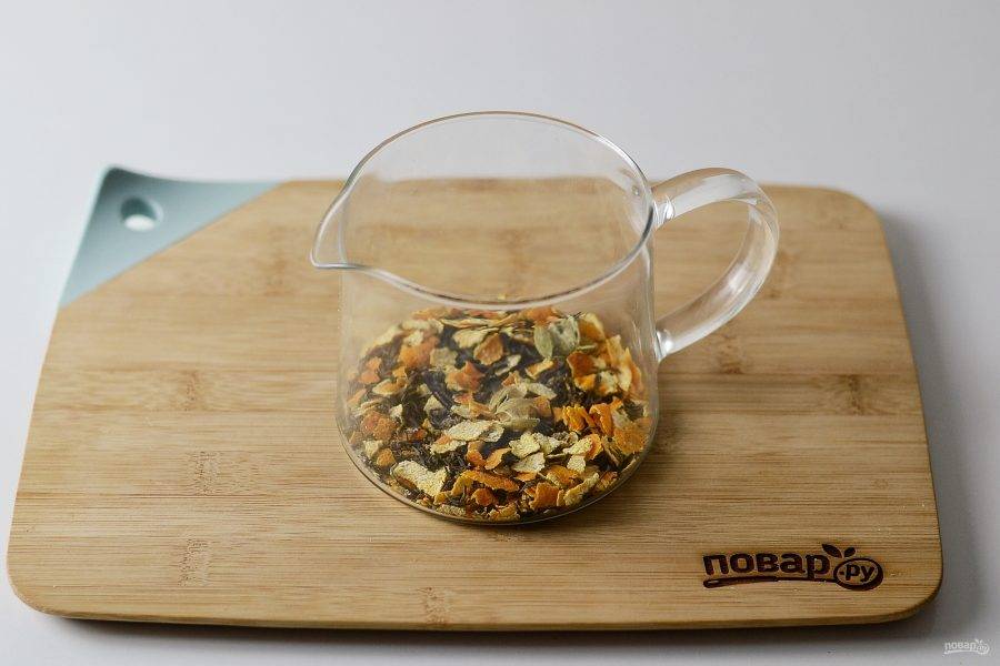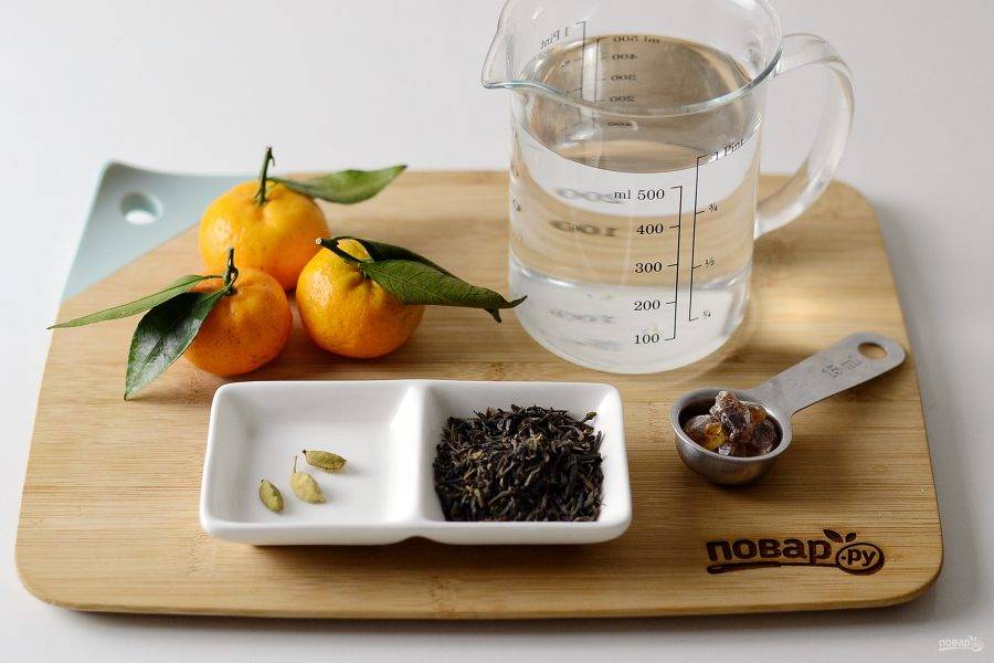 Раскрошите высушенную мандариновую кожуру на маленькие кусочки. Смешайте с черным чаем и кардамоном. Переложите в заварочный чайник.