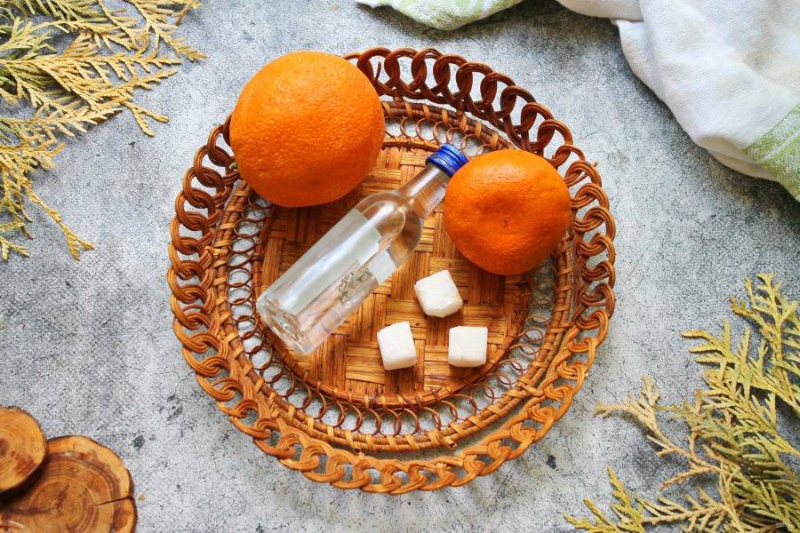 Подготовьте все необходимые ингредиенты для приготовления мандаринового ликера. Апельсин и мандарины тщательно вымойте и обсушите.