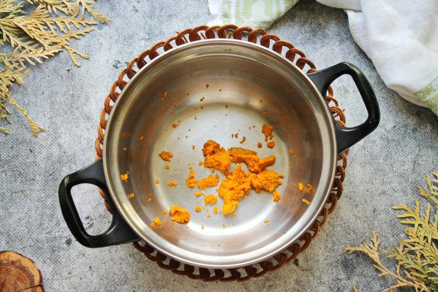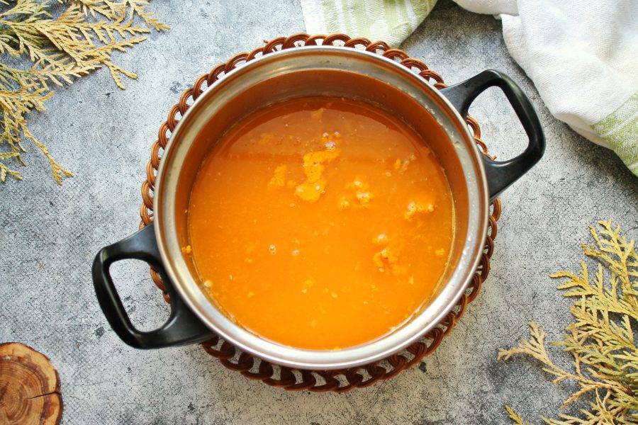 С апельсина натрите цедру выложите ее в кастрюлю с толстым дном.