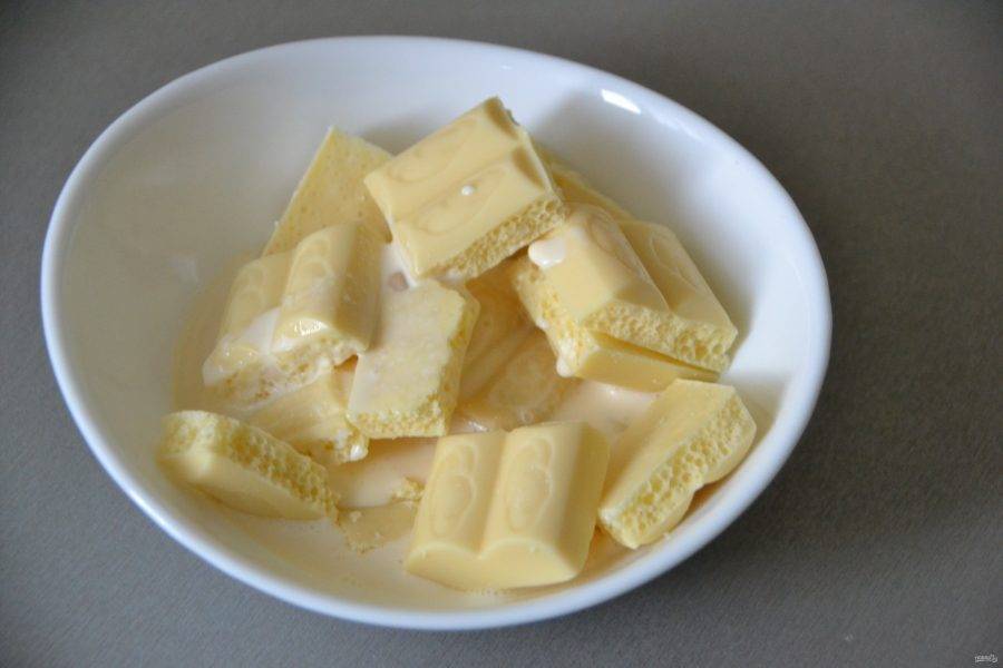 Разломите белый шоколад на дольки, добавьте 50 мл. сливок. Короткими импульсами по 10 секунд растопите в микроволновой печи, после каждого раза перемешивайте.