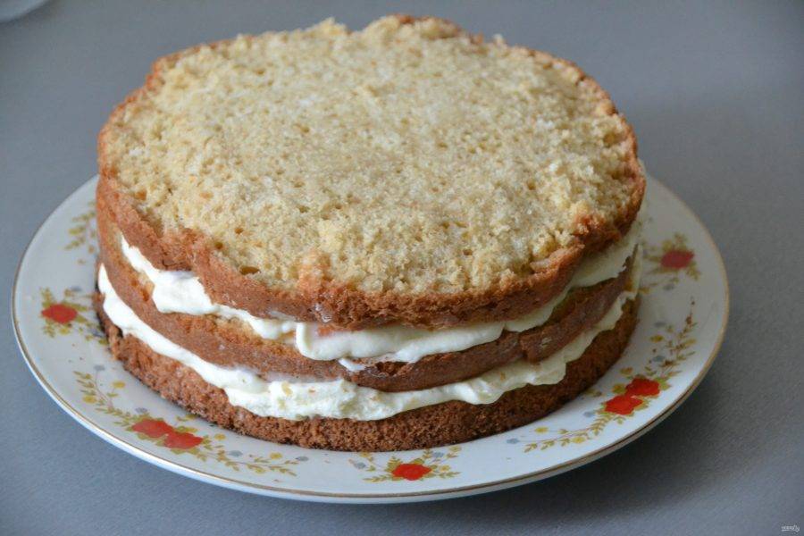 Накройте третьим коржом, затяните пищевой пленкой, поставьте в холодильник на 6-8 часов.