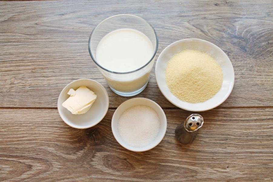 Подготовьте все необходимые ингредиенты для приготовления каши из семолины на молоке.