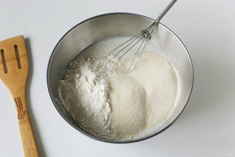 Добавьте кефир и соду. Перемешайте до появления пузырьков, добавьте масло, снова все перемешайте и всыпьте муку и манку.