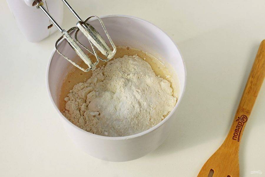 Перемешайте. Добавьте муку и соду.