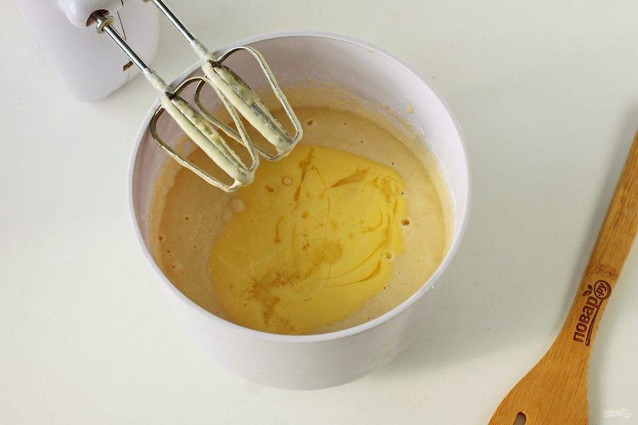 Снова все перемешайте до однородного состояния. Влейте растительное масло и растопленное охлажденное сливочное (можно заменить на маргарин).