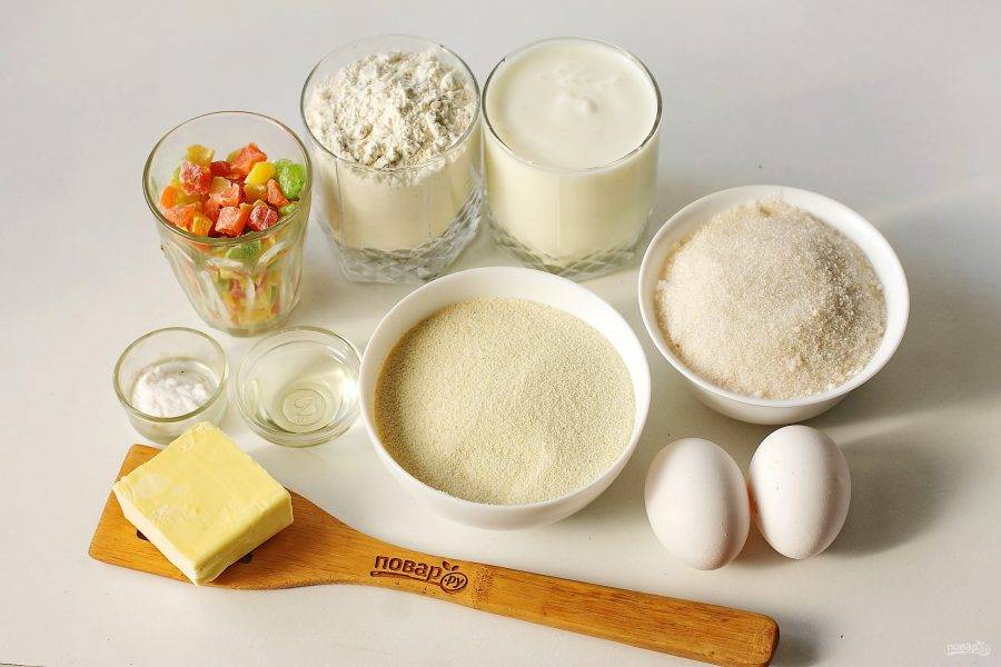 Рецептов выпечки мало не бывает. Поэтому держите ещё один о том, как приготовить манник на кефире. Получается очень нежное сладкое лакомство для всей семьи. Не бойтесь добавлять цукаты и сухофрукты.