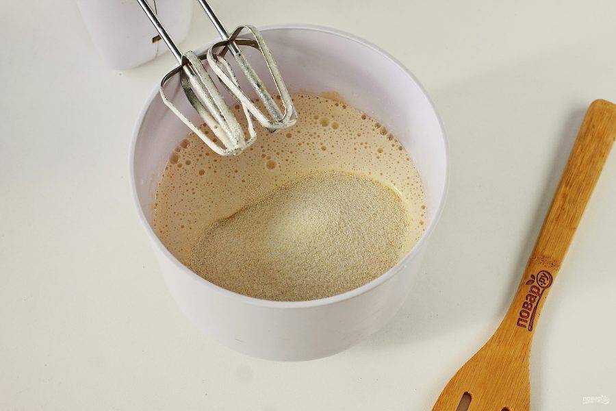 Яйца взбейте с сахаром, добавьте манку и кефир.
