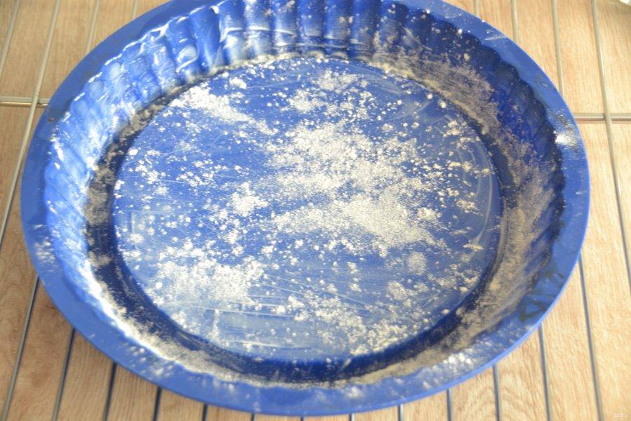 Подготовьте форму для выпечки, смажьте сливочным маслом и присыпьте слегка мукой.