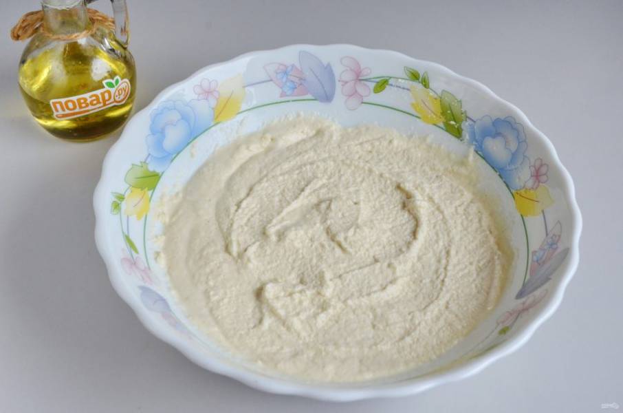 2. В глубокой посудине соедините манку и кефир, перемешайте и оставьте на 40 минут в тепле или просто на столе.
