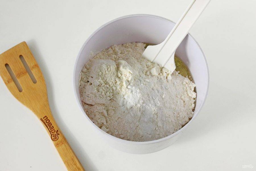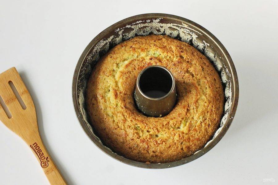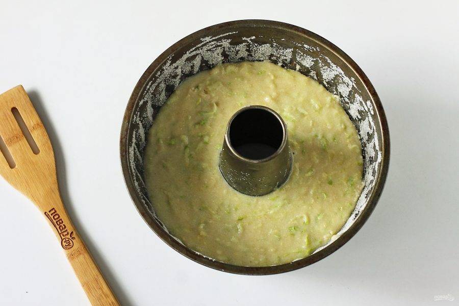 Форму для выпечки смажьте маслом и присыпьте манкой или мукой. Вылейте тесто и выпекайте в духовке при температуре 200 градусов около 30-40 минут.