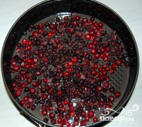 4. Смазать противень или форму для выпечки растительным маслом и слегка посыпать манной крупой. Выложить на противень или в форму чернику и клюкву.